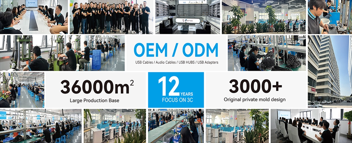 We are a professional manufacturer specializing in USB Cables, Audio Cables, Wireless Charger Cables, OTG Adapters, Card Readers, USB Hubs and mainly provides OEM/ODM services to global brands. Currently have about 3000+ private model products and release 6-8 new products every month!