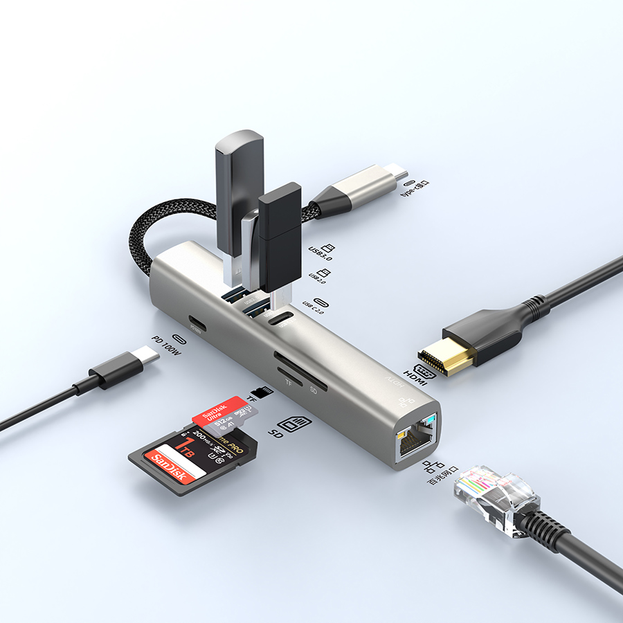 - Interface: USB-C Male to HDMI+USB-A 3.0+USB-A/C 2.0+USB-C 100W+SD/TF Card+RJ45 Ethernet