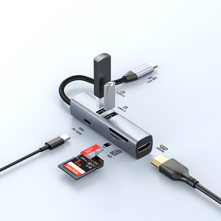- 6 в 1 Connectivity: The USB C Multiport Adapter is equipped with a 4K HDMI port, a 5 Gbps USB A data port, a 480Mbps USB A data port, a 100W USB C PD port, and SD/TF card readers.